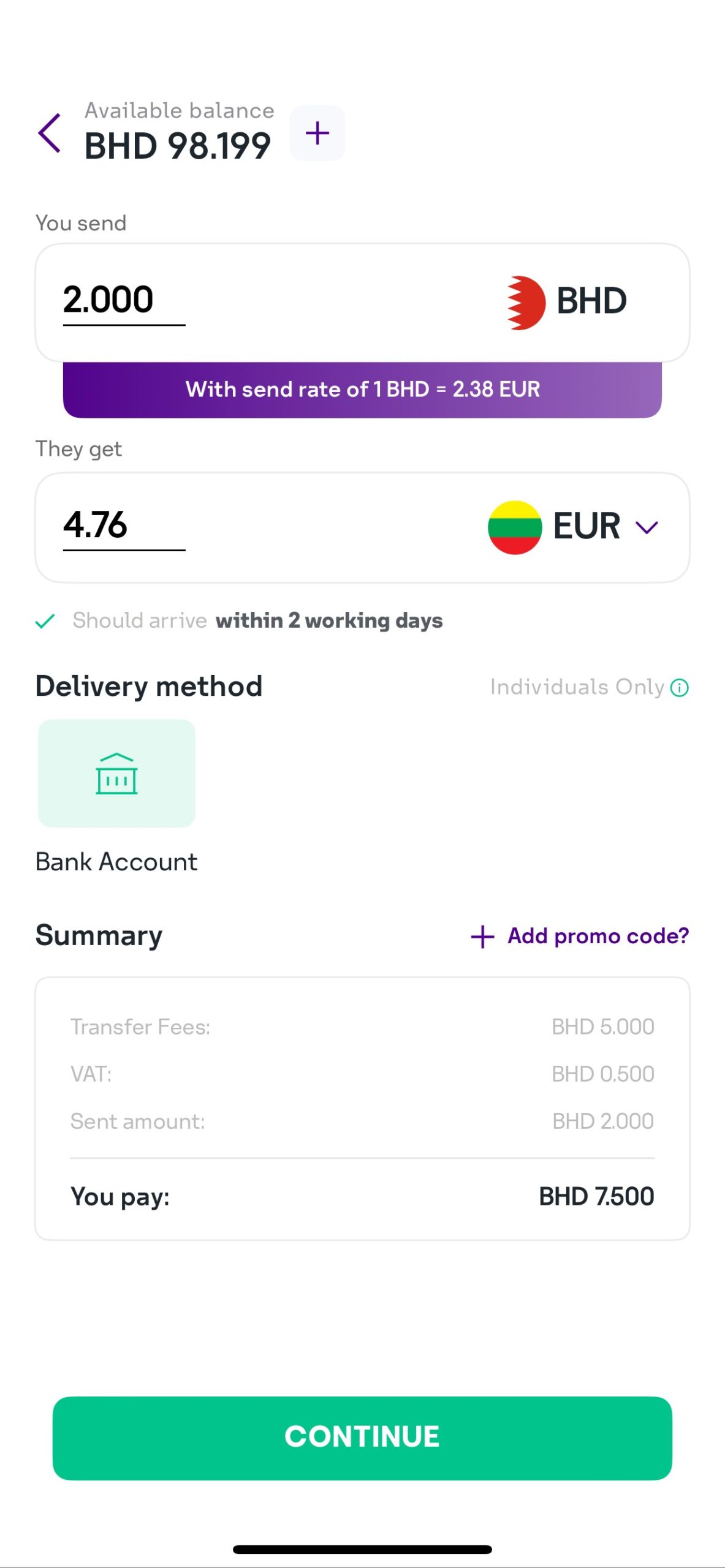 Make bank deposits to any bank. Transfers to bank accounts will be processed within 2 working days. Limits: Transfer up to BHD 2,000 per transaction.